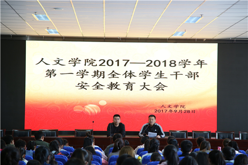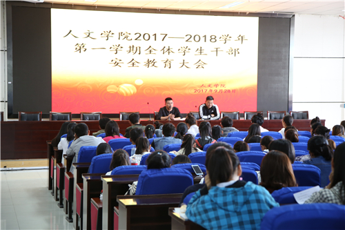 在贺兰山校区文荟楼东侧报告厅举行了2017—2018学年第一学期全体学生干部安全教育大会。学院党委副书记马小军,2017级辅导员潘巍出席了会议, 学院全体学生干部参加。