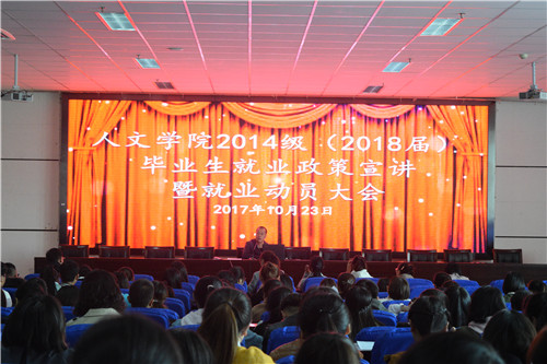 2014级毕业生就业政策宣讲暨就业动员大会在文荟楼东侧报告厅召开。会议由学院团委书记、学生工作办公室主任刘杰主持召开, 2014级全体毕业学生参加。