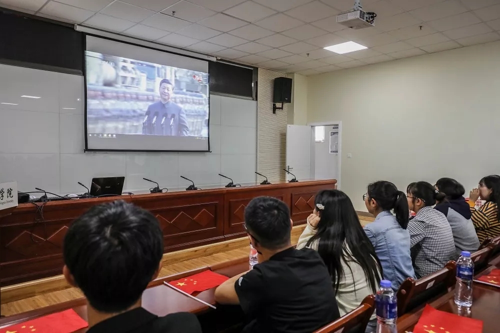 10时,阅兵式正式开始,大家一起高唱国歌,聆听习近平总书记的谆谆教诲。当习近平总书记讲:“伟大的中华人民共和国万岁!伟大的中国共产党万岁!伟大的中国人民万岁!”后,会议室响起热烈的掌声。在一声声“同志们好,同志们辛苦了”和一声声“主席好,为人民服务”中,大家激动万分,热情洋溢。庆典现场的人民军队气势磅礴,声音高昂,步伐整齐,行军有序,充分展现了中国军人的飒爽英姿。“听党指挥,能打胜仗,作风优良”,人民军队重任在肩,奋勇向前。空中护旗机队破风而来,“70”的字样鲜艳夺目,谱写着新中国的强军战歌。观看现场的师生为祖国的人民军队送上一阵阵热烈的掌声,他们都为祖国的强大心生自豪,过去的苦难他们历历在目,今日的繁荣他们铭记于心。