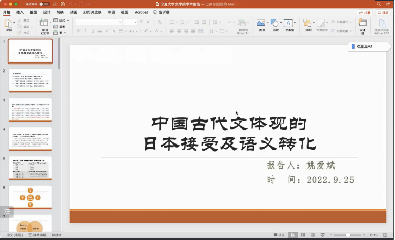 姚老师主要从中国古代“文体”概念释义现状、中国古代“文体”概念基本要义、“文体”概念的第一次语义转化、“文体”概念的第二次语义转化和“国语”建构中的“文体”概念等方面,对中国古代文体观的日本接受及语义转化进行相关阐发。