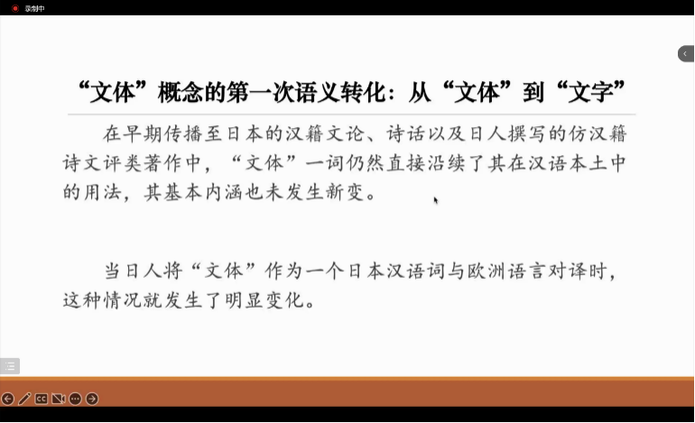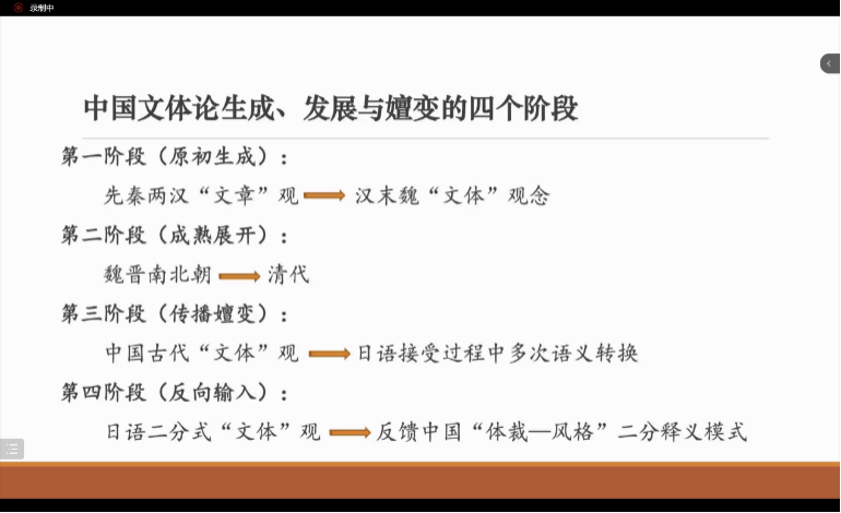 再次,姚老师还梳理了中国传统“文体”概念进入日本语言文化语境后所产生的语义转化过程。