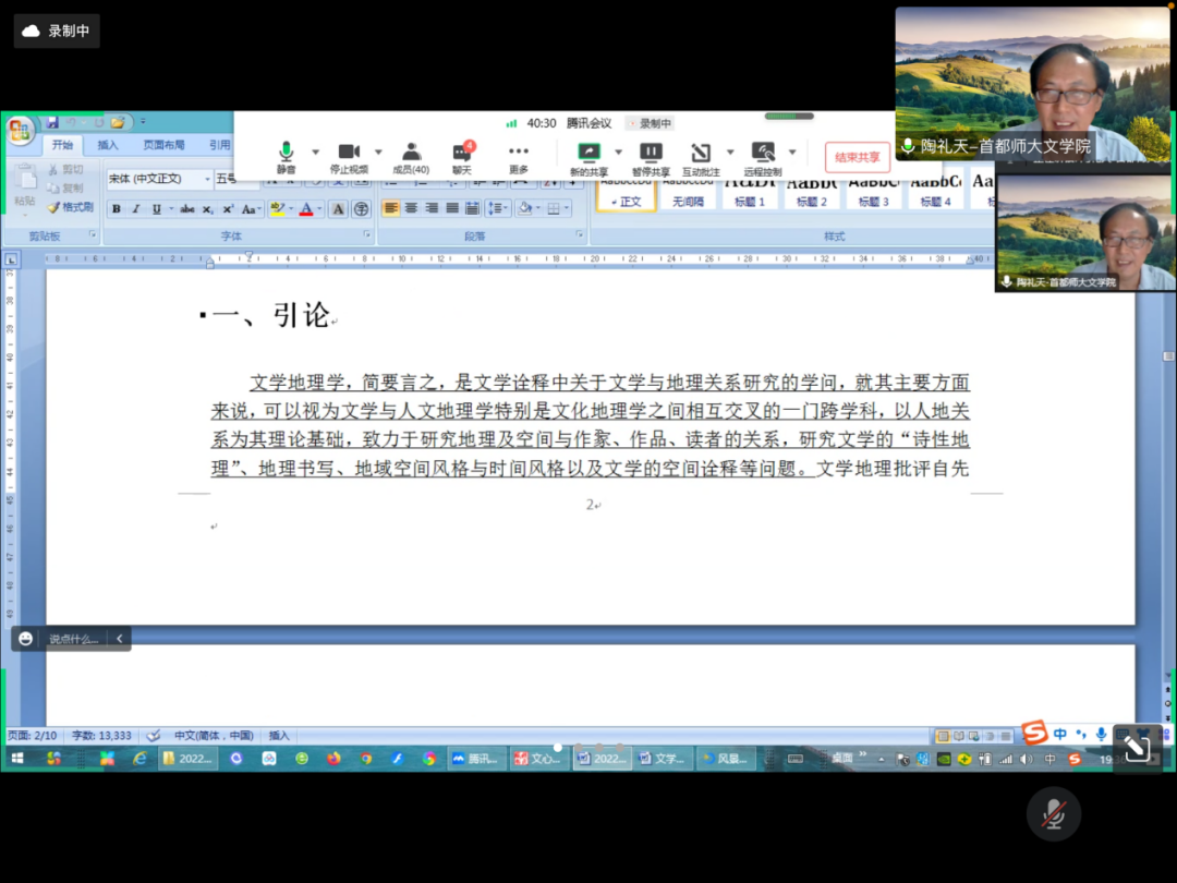 首先是引论,这一部分为大家详细介绍了文学地理学是什么,要怎么研究。其二,是与本论题有关的人地关系论溯源。其三,是“人杰地灵”说与“贤才不择地而生”说之关系辩正。本节在前面的基础之上对两种似乎相反的观点进行补充,作出辩正的思考。其四,“江山之助”说与“不待于江山之助”说之辨正。最后,陶老师分享了自己的四个结论。第一,文学地理学以人地关系即作家与地理的关系为科学基础,以文学作品与地理(文学地理)的诸多复杂关系为研究中心,对作家与地理关系的研究,仍然是从其作品为研究对象展开的。第二,中国古代的文学地理批评,能够辨正地分析文学与地理的关系问题,既强调“人杰地灵”,也强调人才“不择地而生”,没有陷入地理环境决定论的泥淖。第三,《文心雕龙》具有丰富的较为系统的文学地理批评思想,其“江山之助”说对后代影响甚大,对楚辞学也具有重要的理论贡献,把握“江山之助”说的理论内涵,应该结合《文心雕龙》整体理论批评体系进行理解。第四,郝经提出的“不待于江山之助”说,强调“外游”必以“內游”为前提与基础,具有一定的新的理论内涵与意义。