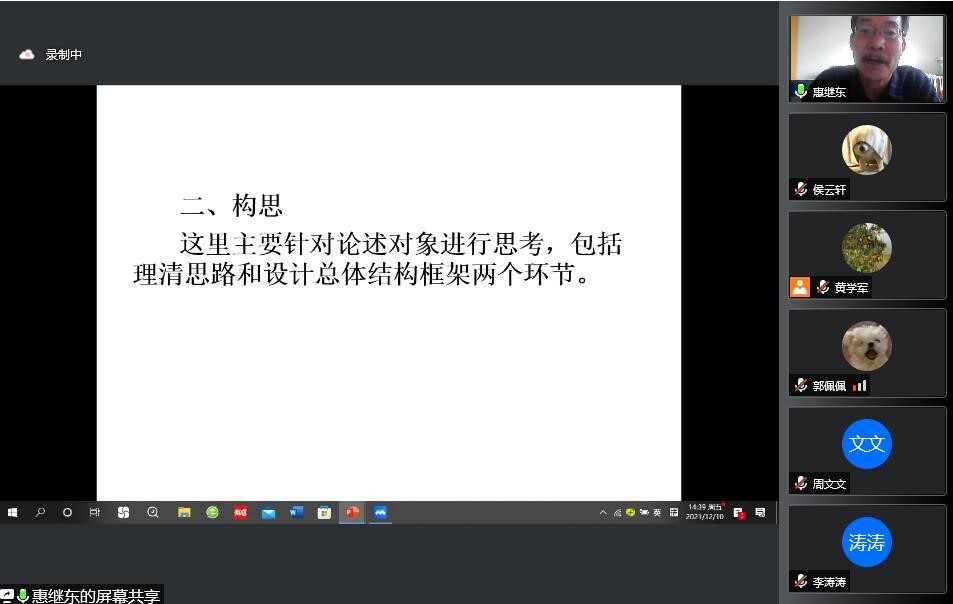 惠教授对学位论文构思环节的讲解,主要是谈如何对研究对象进行考察,包括理清思路和设计总体结构框架两个环节。关于理清思路,惠教授表示,要在选题及打腹稿过程中就对研究对象提出一种新的阐释,这能使论文创作初始就因选题的新颖性而独树一帜。在理清思路之后,才能开始进行总体结构框架的设计,惠教授还细心地指出了往年学生结构框架中引言、关键词方面存在的问题,以此提醒同学们避免犯同样的错误。
