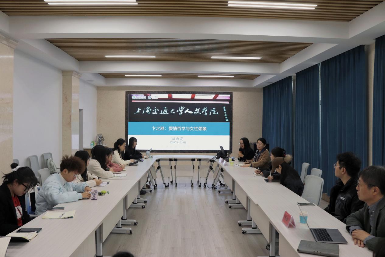 与上海交通大学长期以来的友好交流传统,并表达了对今后两院持续交流合作的良好愿望。随后,汪教授从其对卞之琳爱情哲学研究的选题初衷谈起,引发同学们对闻一多“卞之琳是‘不写情诗’的诗人”这一观点的思索,并以卞之琳的《断章》为引,引领大家进入了卞之琳的诗歌世界。之后,汪教授详细解读了卞之琳的《鱼化石》一诗,从爱情的关系性、时间性、创造性三个维度分析了卞之琳的爱情哲学,进而运用女性主义批评、弗洛伊德精神分析等理论方法剖析诗人的内心世界,同时援引诗人卞之琳与张充和交往经历的相关史料补充论证,深入分析了卞之琳诗歌中的女性想象。并由此指出,爱情书写在卞之琳的诗歌创作中不仅占有一定比重,而且在他整体的诗歌创作中还显现出一定的连续性。汪教授的讲座立足于文本分析,占有大量丰富的史料,理论功底扎实,实现了理性与诗性的完美融合,为在场的研究生做了一次很好的研究范式和路径展示。