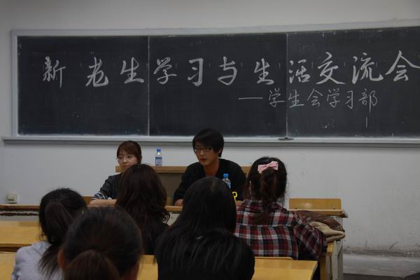 学生会在B区综合楼举行了2010级新生与老生学习、生活经验交流会。旨在引导2010级新生迅速转换角色,尽早融入到大学的新生活,同时针对大一新生迷茫好奇的心态,我们邀请了高年级优秀的学长学姐与新生进行交流。活动前期我们搜集了很多新生最需要解决的问题,希望可以针对性的回答他们的疑问。