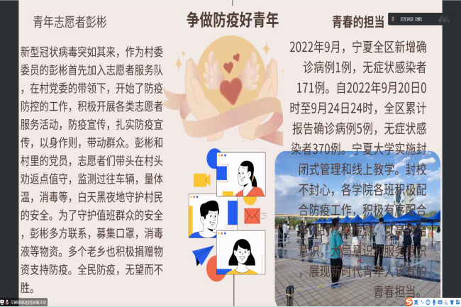 学子生力军和突击队作用,展现青年战“疫”担当,凝心聚力筑牢校园疫情防控安全防线。同时号召同学们要向青年抗疫英雄学习,肩负起时代赋予我们的使命,用实际行动唱响新时代青春之歌。