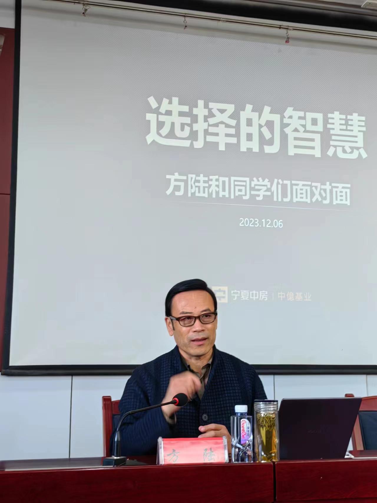 中文系81级校友、著名企业家方陆从自己攀登珠峰、参加马拉松、三考中举、做企业的快与慢等方面,为现场的大学生做了精彩讲座,并回答了学子们关于人生选择和创业方面的提问。活动现场,方陆还分享了自己的新著《知微见陆》,并为大家赠书。