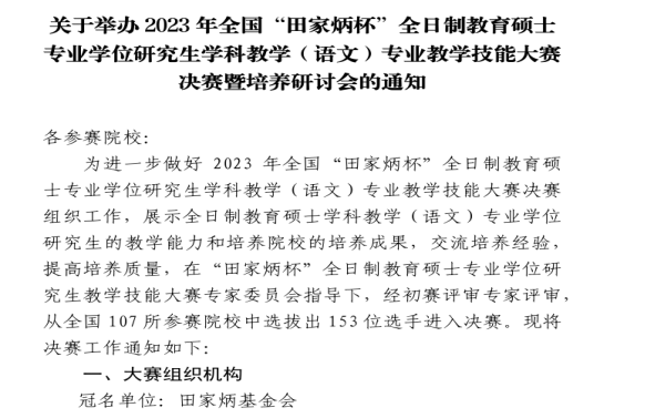 2023年10月15日,由全国教育硕士专业学位教学指导委员会指导,长春师范大学主办的2023年全国“田家炳杯”全日制教育硕士专业学位研究生学科教学(语文)专业教学技能大赛决赛圆满落幕。我校电子游戏