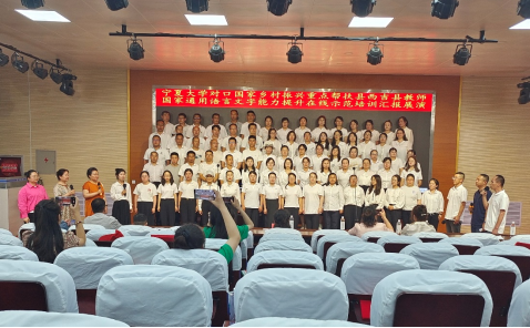 具体组织实施。培训教师团队由18位专家教师和12名助教共30人组成,来自西吉县的103位中小学教师作为受训学员参加了培训,师生比达到1:3左右。培训班班主任由西吉县教师发展中心杨俊琪主任担任。专家教师团队阵容强大,其中包括我区著名播音员张巨红、张静涛,朗诵艺术专家张春波、杨煦山立,国家级普通话测试员杨润萍、马明艳、杨睿,语言文字专家朱富林、柳玉宏,语文教育专家仇千记,国学文化专家李仁安、杨胜利等。培训内容分线上、线下两大板块,线上培训包括普通话发音、课堂教学语言、中华优秀传统文化、中华民族共同体意识等内容,授课达到66课时。7月18日,线上培训全部结束。7月19日,培训团队赴西吉县开展线下送教活动,内容包括培训团队与学员座谈、专家教师面对面指导发音训练和答疑、专家教师指导排练朗诵节目等。