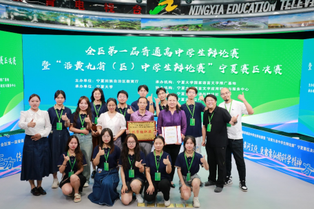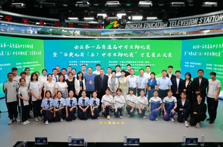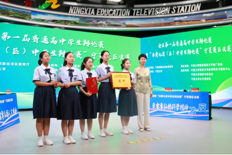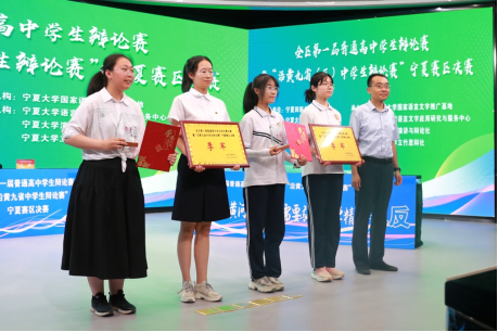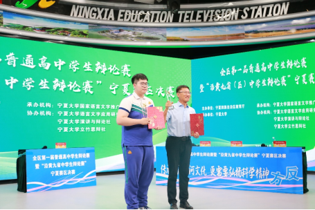 孙姝源同学担任比赛主持人。经过激烈交锋,最终中卫市第一中学捧获决赛冠军奖杯。获得冠亚军的中卫市第一中学和宁夏银川一中,将代表宁夏高中学校出征8月份在山东举办的沿黄九省普通高中学生辩论赛。