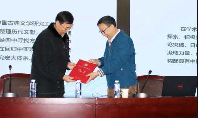 会议伊始,胡玉冰教授对刘跃进研究员的到来表示热烈欢迎,并向大家介绍了刘先生在文学领域所作的重要贡献,同时向其赠送了纪念证书。随后,刘先生从学术梯队的日益完善、学术水准的普遍提高、文献整理的时代特色、理论研究的根本方向、回归经典的历史趋势、古典文学的现实感召、文化交流的特殊媒介、中华文学的观念建构八个方面对当代古典文学研究前沿情况进行了论述。