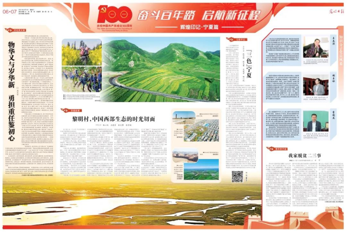 6月5日,《人民日报》《光明日报》《经济日报》“奋斗百年路 启航新征程”特刊(专版、特别报道)推出“宁夏篇”,以12个版的篇幅全面报道宁夏深入学习贯彻习近平新时代中国特色社会主义思想,立足新发展阶段,贯彻新发展理念,融入新发展格局,推动黄河流域生态保护和高质量发展先行区建设顺利开局、蓬勃展开所取得的发展成就。《光明日报》第七版《知识分子党员风采》栏目遴选报道了三位宁夏知识分子党员代表的先进事迹,电子游戏