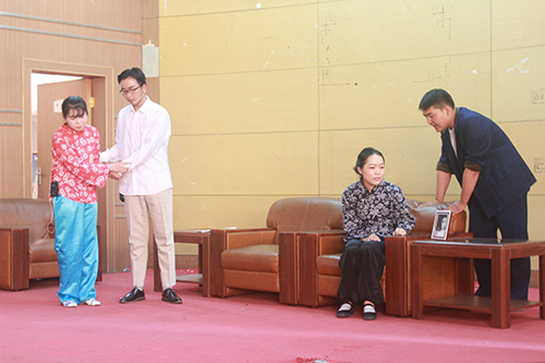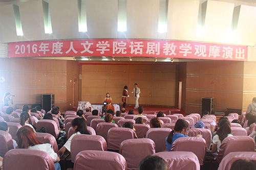话剧教学观摩演出在怀远校区图书馆一楼报告厅成功举行。院党委书记鲁晋,院长胡玉冰,副院长王岩森、刘鸿雁、杨浣,部分中文系老师和14、15级学生观看了此次演出。 本次话剧教学观摩演出以2014级汉教一班带来的《罗密欧与朱丽叶》拉开帷幕,忠贞凄美的爱情故事令人唏嘘感叹。接着,2014级文秘班带来了享誉世界的喜剧《伪君子》,让观众在笑声中思考人生的真假善恶。曹禺的《雷雨》1935年首演,至今上演不衰,被誉为“表演的教科书”,2015级中文系学生的精彩演绎赢得了观众阵阵掌声。最后,2014级汉教二班带来了《暗恋桃花源》,真挚持久的恋情与人生沧桑交织在一起,不禁让人潸然泪下。 演员们张力十足的表演使得故事和人物形象变得生动、鲜活起来,现场观众仿佛亲身感受到了剧中演绎的悲欢离合、爱恨情仇,不时响起热烈的掌声。 演出落幕后,胡玉冰院长对整场演出作了精彩点评。他首先称赞了演员们的精彩表演,然后对四场话剧的指导老师——丁峰山、魏兰、李生滨、白晓荣、范文艳、于凤艳、马永利的指导水平和辛勤工作予以肯定。同时,胡院长充分肯定了话剧表演这种教学方式,不仅培养了中文系学生的专业知识和学科素养,强化了学生对话剧及表演艺术的欣赏和尊重,还是电子游戏