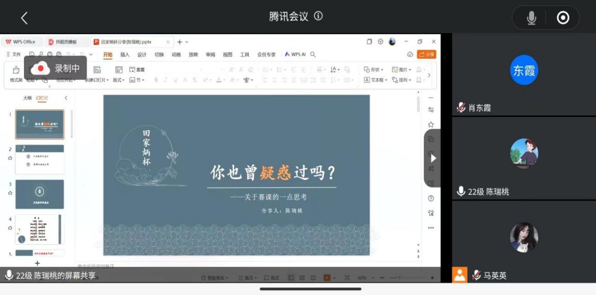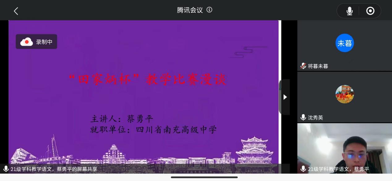 在腾讯会议平台顺利举行了第二期“田家炳杯”教学技能大赛参赛经验分享会。分享会旨在通过“田家炳杯”教学技能大赛参赛经验的分享,提升学生的专业技能水平,为本年度教学技能大赛做好充分准备。会议由沈秀英老师主持,邀请了2021级的蔡勇平和2022级的陈瑞桃同学分享他们的参赛体验和心得。梁艳老师和杨志云老师对两位同学的分享进行了精彩的点评,提供了宝贵的建议和指导。2023级学科教学(语文)全体学生与会。